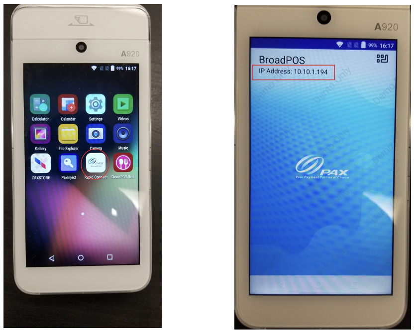 When you run BroadPOS on A920, the IP Address of A920 is shown on the top left.