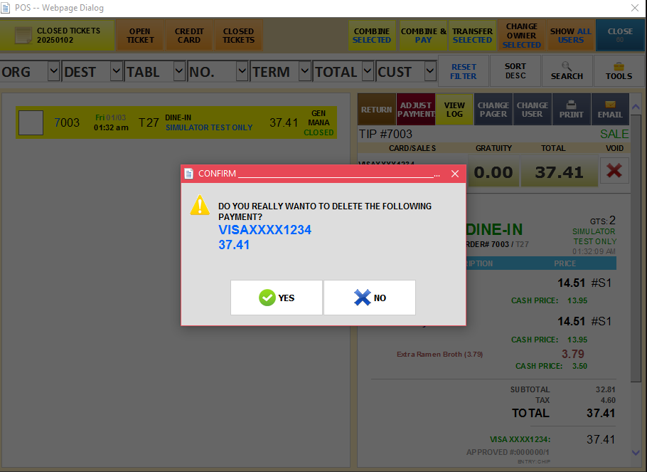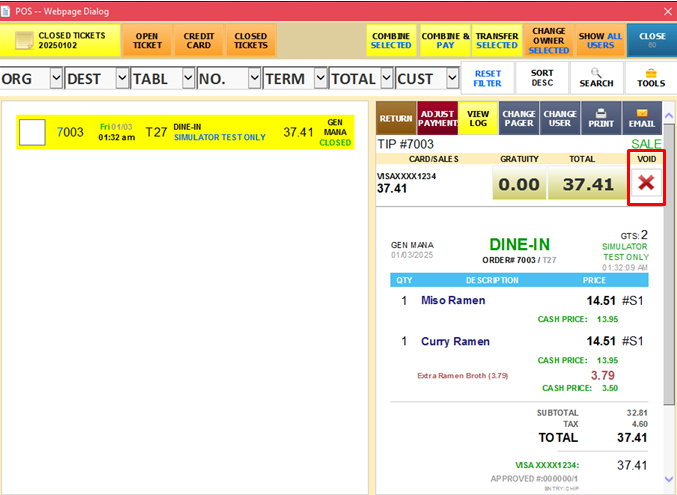 When prompted for confirmation, press YES. If you do not have permission to do VOID it will ask for the manager's access code.