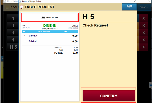 Once selected on the POS, servers have the option to PRINT TICKET or CONFIRM.