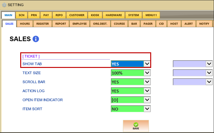 1. Menu > Setting > Main > Sales > Ordering > Ticket > Show Tab