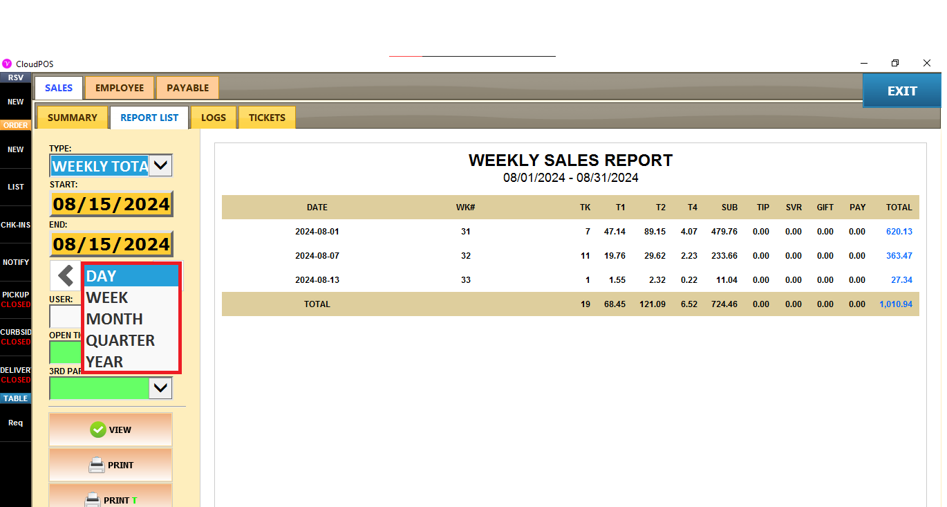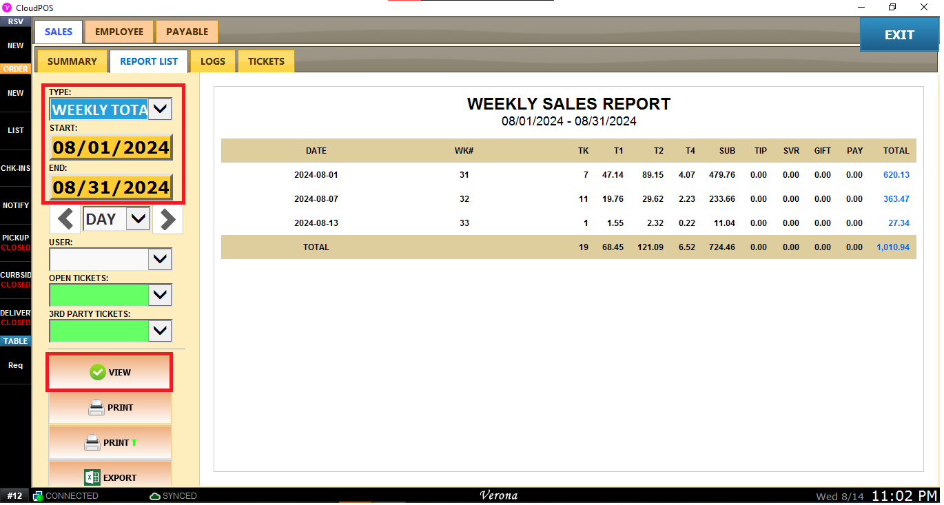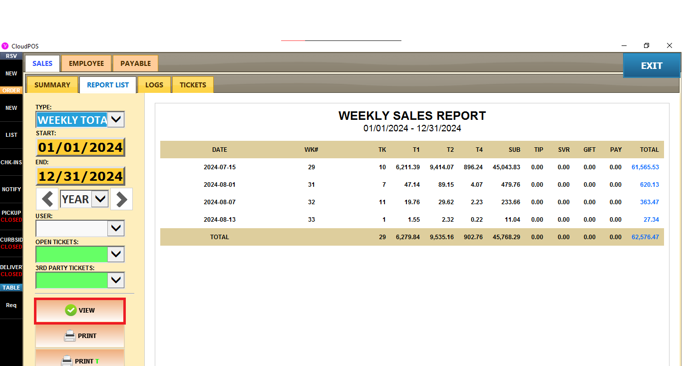 2. Use drop TYPE > WEEKLY TOTAL, choose the START and END and press the button VIEW.