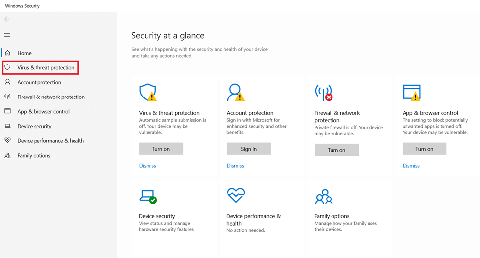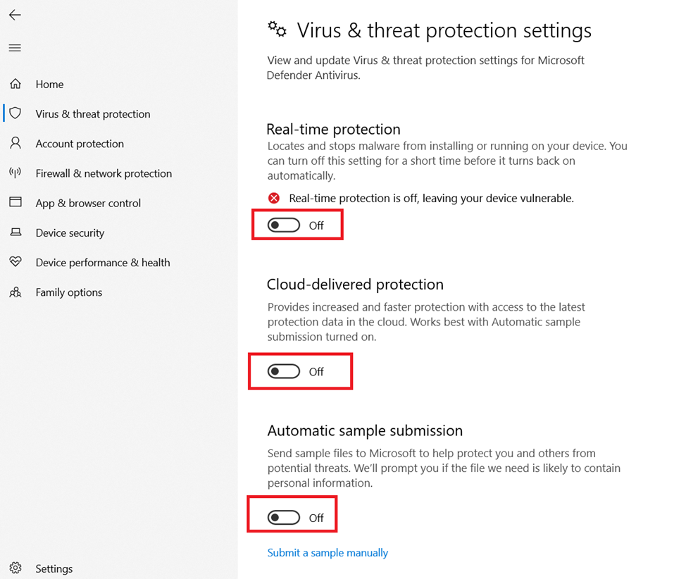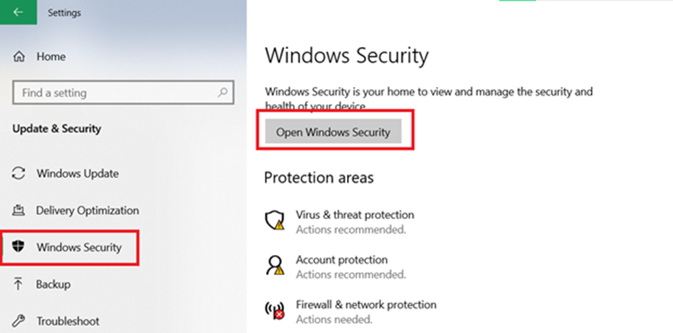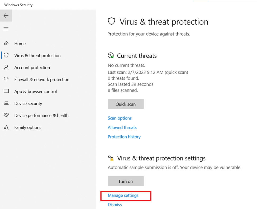 2. Windows Security > Open Windows Security > Virus & Threat Protection > Manage Setting
