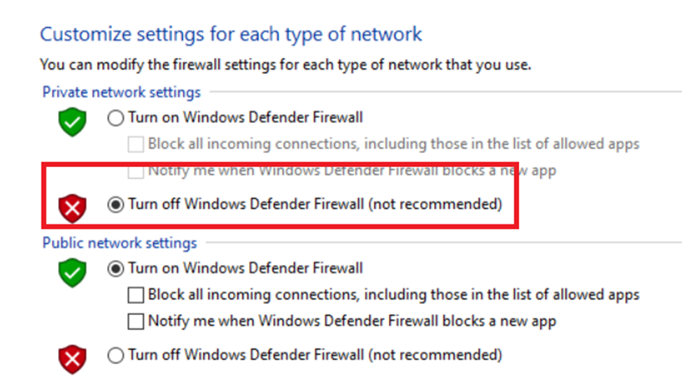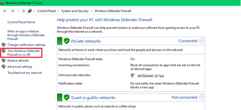 1. Control Panel > System and Security > Windows Defender Firewall > Turn Windows Defender Firewall on or off